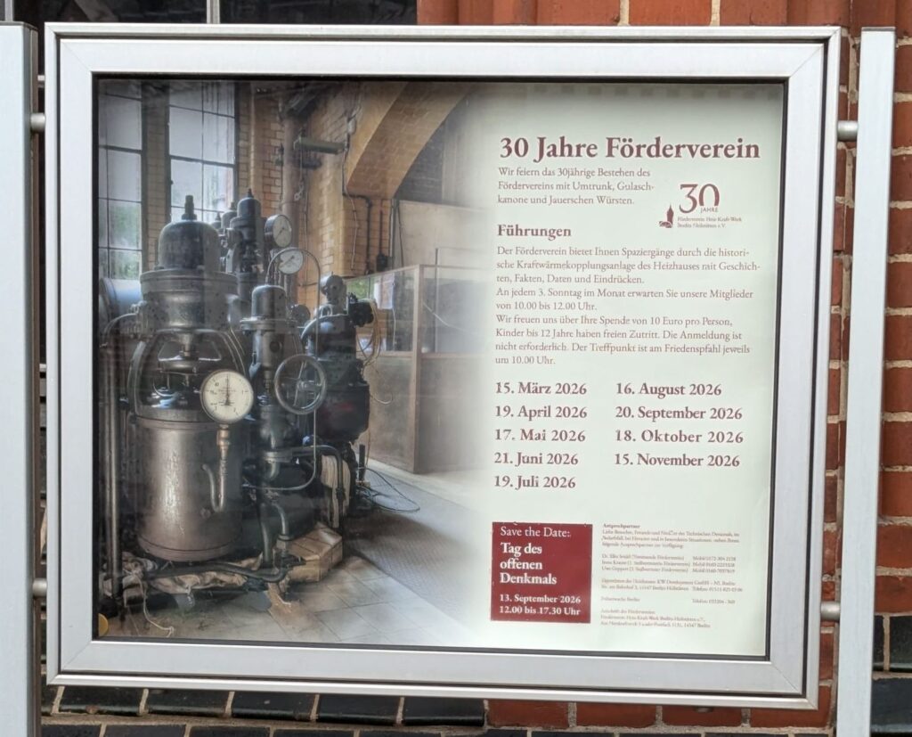 Liebe Freunde des Technischen Denkmals der Kraftwärmekopplung in Beelitz-Heilstätten Unser Förderverein begeht 2026 sein 30 jähriges Bestehen. Wir laden Sie schon jetzt zu den unterschiedlichen, vielfältigen Treffen am und im Heizhaus ein. Wir lassen die regelmäßigen Führungen durch unser Herzstück…
